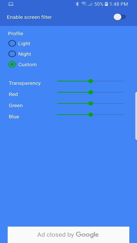 Creates a filter in your screen; with this you can dim your screen, or make it brighter. Predefined profiles for night mode and back-light and a customize option are provided.