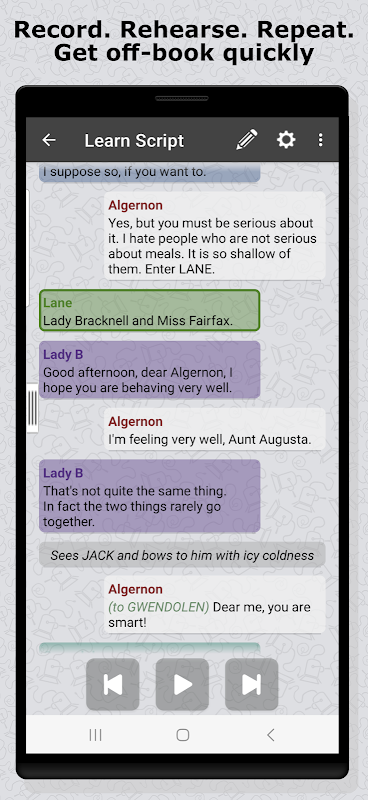 Anda bisa langsung mulai merekam suara Anda sendiri. Atau Anda dapat mengimpor skrip teater atau film* atau cukup mengetik baris Anda. Script Rehearser akan membacakannya kembali kepada Anda kapan pun Anda mau menggunakan opsi yang dapat disesuaikan untuk meminta Anda. Optimalkan bagaimana Anda berlatih saat Anda maju.
