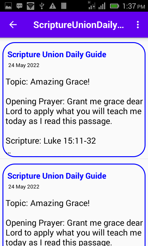 Aplikasi seluler Bible Union Daily Guides adalah alat yang menyediakan cara mudah untuk membaca renungan harian Anda saat bepergian, ini menyediakan antarmuka yang mudah digunakan yang mengatur pembacaan ke dalam tanggal kalender membuatnya