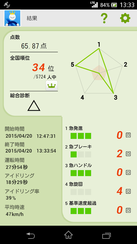 急発進、急ブレーキ、急ハンドル、急旋回、基準速度オーバーの5つの指標をもとに、減点方式で測定します。
