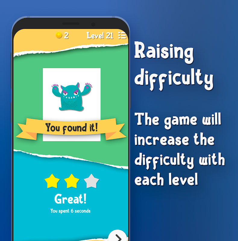 Temukan Monster: mencari benda tersembunyi adalah permainan keterampilan yang lucu untuk anak kecil. Mereka harus menemukan karakter lucu yang tersembunyi dalam waktu sesingkat mungkin. Pada awalnya itu akan dimulai sebagai permainan yang mudah karena akan ada beberapa objek dan monster di layar, tetapi kesulitannya akan meningkat dengan setiap level dan karakternya akan berlipat ganda! Ini juga merupakan permainan gratis tidak seperti permainan pikiran lainnya.