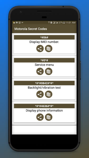 Now You can Discover the secret world of your Android base mobile devices. Some code of them may not work on specific devices, but you can still try them because their manufacturer does not allow them. When those codes are typed manually from the phone dialer or you can copy this code with long press on code and paste it on clipboard. There is also Functionality in the Motorola Secret Codes to share it with Social Apps free and offline.