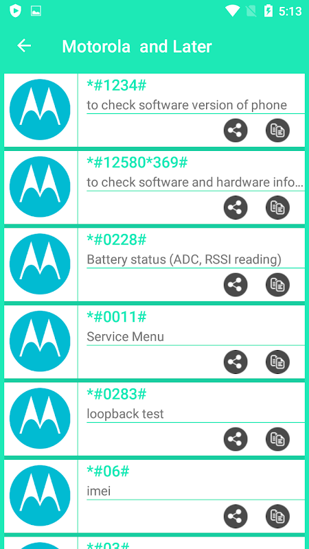 Now You can Discover the secret world of your Android base mobile devices. Some code of them may not work on specific devices, but you can still try them because their manufacturer does not allow them. When those codes are typed manually from the phone dialer or you can copy this code with long press on code and paste it on clipboard. There is also Functionality in the Motorola Secret Codes to share it with Social Apps free and offline.