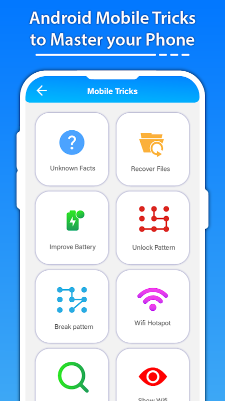 Kuasai ponsel Android Anda dalam hitungan menit dengan aplikasi ini. Ponsel mendukung beberapa kode sandi. Ketika kode-kode ini dimasukkan secara manual dari telepon, mereka menampilkan beberapa statistik sederhana tentang perangkat Anda. Panduan Telepon Saya memiliki banyak informasi rahasia tentang telepon Anda. Kode rahasia Android dan aplikasi tip dan trik ponsel dapat bekerja secara otomatis di ponsel Anda. Anda hanya perlu mengklik kode rahasia yang ingin Anda terapkan. Anda juga dapat membaca kode rahasia apa pun dan memasukkannya sendiri ke dalam telepon. Anda dapat menemukan banyak kode, peretasan, dan trik Android yang tersembunyi dan berguna yang belum pernah Anda ketahui sebelumnya. Pindai perangkat Android Anda dan buka kunci fitur, data, kode, dan peretasan tersembunyi.