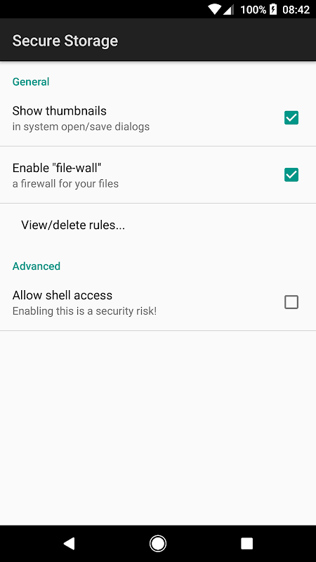 * Upgraded the file-wall for Android 10. Android 10 users who previously enabled the file-wall must either disable it, or allow Secure Storage to display file-wall prompts over other apps.