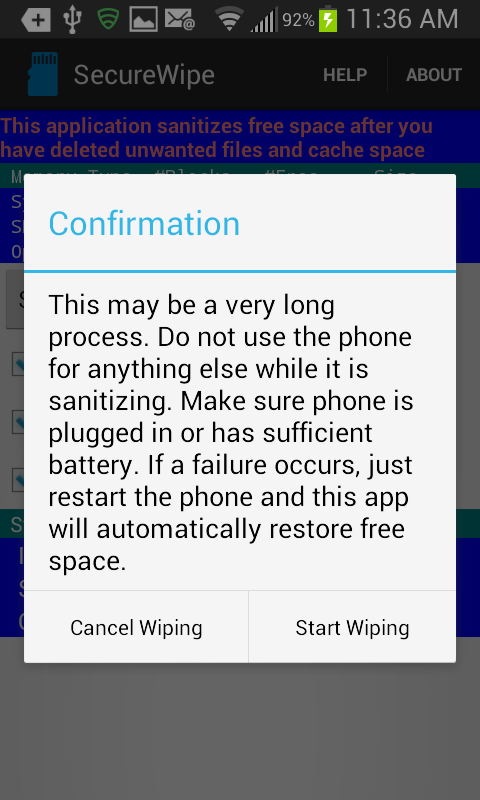This application has not been tested on all phones. Please provide feedback to the developer about any problems. It has been found to work on Samsung Galaxy S2, S3, S4 and Victory phones, the HTC Arrive and others. System space takes several minutes to sanitize and 8GB SD Cards can take up to half an hour. If the application is aborted before it finishes, there may be large files left on the phone. If this happens, simply reboot the phone and bring the application up and it will automatically look for these files and delete them at startup.