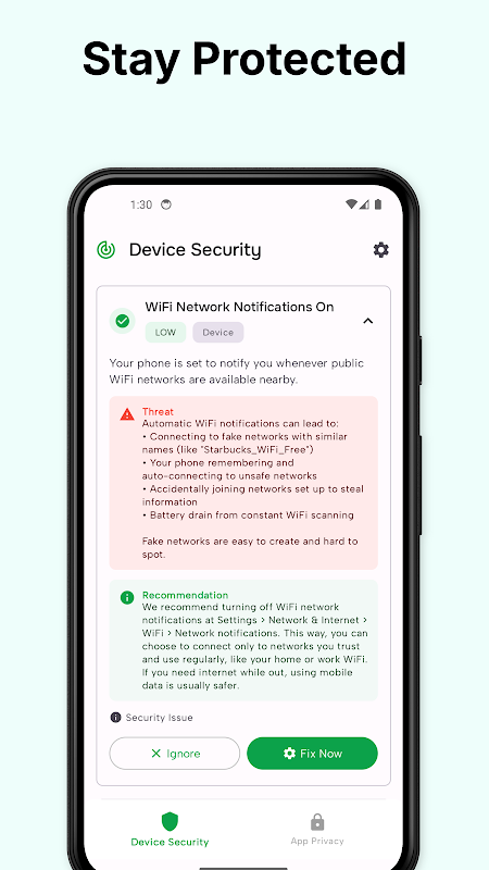 Sempurna jika Anda menggunakan WiFi publik, khawatir tentang izin aplikasi, atau hanya ingin memeriksa keamanan ponsel Anda. Memindai dan memperbaiki risiko privasi umum hanya dalam 2 menit.