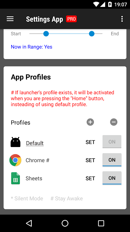 Aplikasi yang berbeda memerlukan konfigurasi dan pengaturan yang berbeda. Aplikasi ini membantu Anda untuk beralih ke set pengaturan yang berbeda untuk setiap aplikasi Anda satu per satu. Ini termasuk volume, orientasi, kondisi jaringan, koneksi bluetooth, kecerahan layar, menjaga layar tetap terjaga, dll.