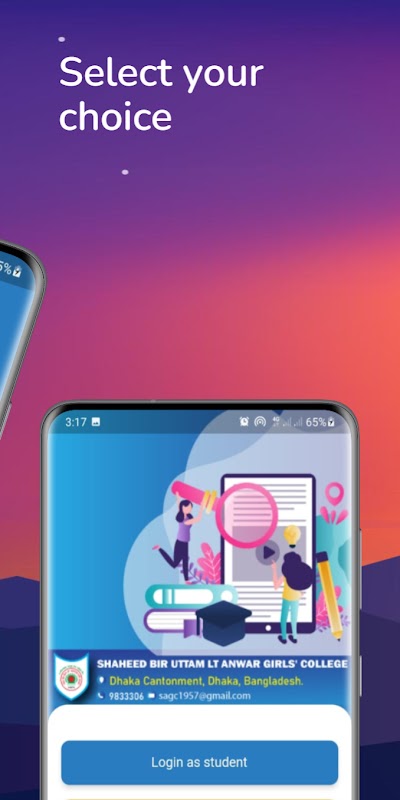 Aplikasi android sekolah pintar untuk SHAHEED BIR UTTAM LT ANWAR GIRLS' COLLEGE. Siswa akan mendapatkan fitur-fitur di bawah ini: Pelajaran Kelas, Buku Harian Kelas, Rutinitas Kelas, dan masih banyak lagi.