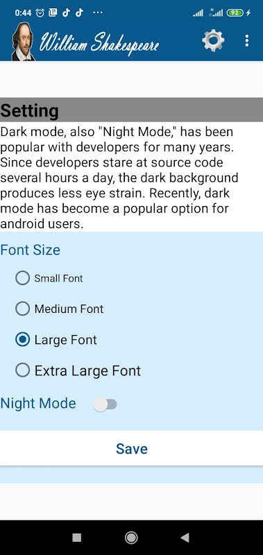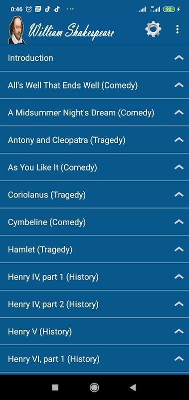 Aplikasi ini terdiri dari semua karya William Shakespeare termasuk Drama, Puisi, Soneta, dan Kutipan. Semua pekerjaan dikategorikan dengan cara yang sangat mudah. Aplikasi ini memuat materi berikut.