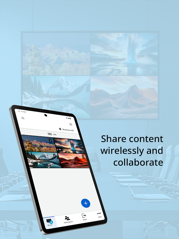 Gunakan aplikasi untuk mencerminkan layar perangkat Anda ke tampilan. Anda juga dapat berbagi gambar atau video dari perangkat Anda atau gambar yang diambil menggunakan kamera Anda. Beberapa item dapat dibagikan secara bersamaan, muncul berdampingan di layar.