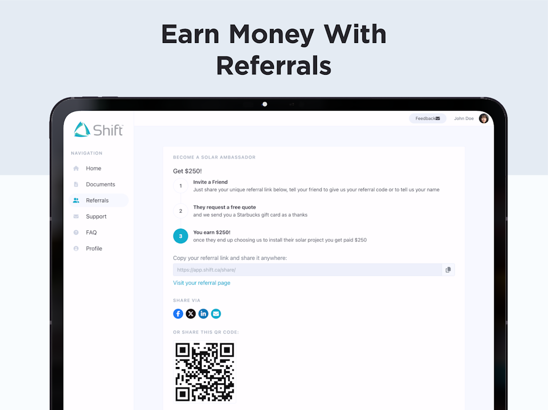 Lacak proses instalasi Anda secara real time, pantau produksi dan konsumsi energi surya Anda setelah sistem Anda diinstal, dapatkan uang dengan merujuk teman dan keluarga Anda, buka tiket dukungan baru atau perbarui detail akun Anda dengan aplikasi Shift.