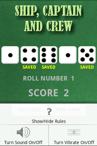 Ship, Captain & Crew adalah permainan bar lama di mana pemain melempar hingga lima dadu dan mencoba untuk mendapatkan 6 (kapal), 5 (kapten), dan 4 (awak) dalam tiga gulungan atau kurang. Total gabungan dari dadu yang tersisa adalah Skor Anda. Skor tertinggi menang. “SELAMAT BERUNTUNG”