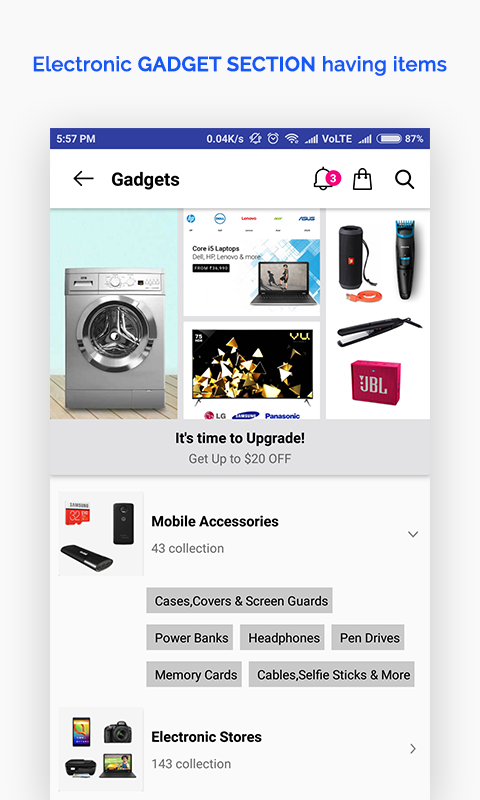 Categories : Our app has several categories like Home,Men, Woman, Kids, Gadget, Beauty and the list goes on