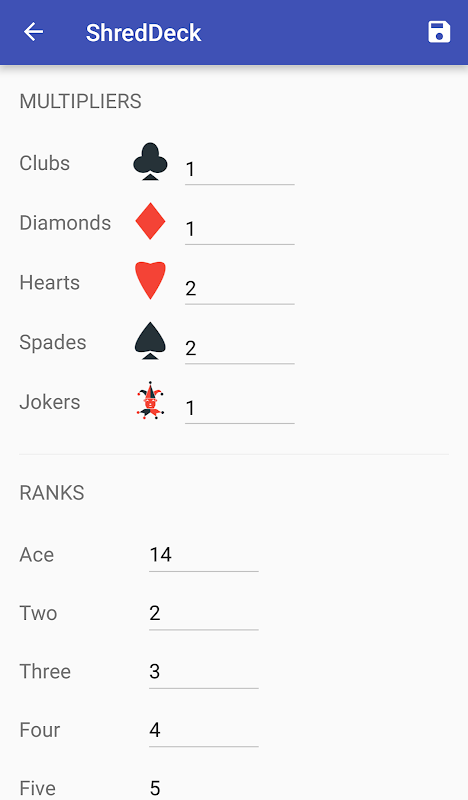 Latihan dapat sepenuhnya disesuaikan dan disimpan. Gunakan latihan Anda sendiri (setiap 5 akan melakukan). Lihat riwayat latihan. Tambahkan kesulitan dengan menambahkan pengganda atau menyesuaikan nilai yang terkait dengan masing-masing nilai rank. Anda bahkan dapat menambahkan Jokers tambahan.