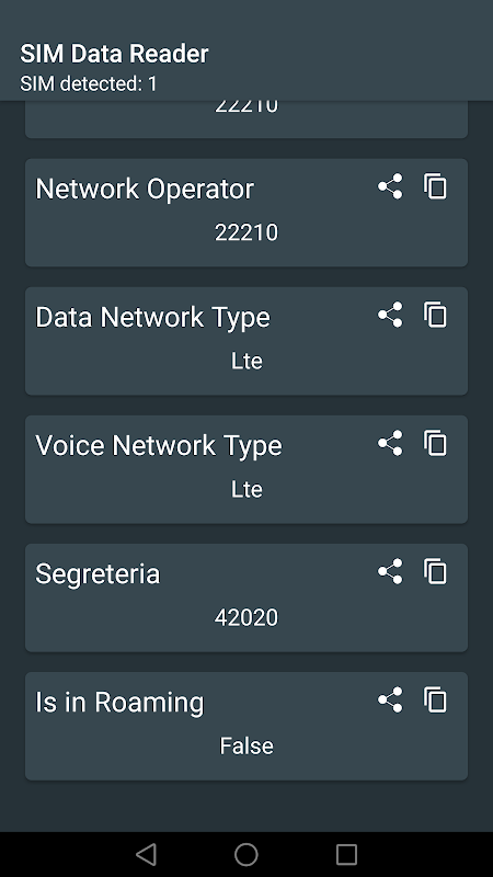 Può fornirti ICCID, IMSI, MCC, MNC, numero di telefono(non tutte le sim lo hanno salvato), codice nazione, operatore, stato del roaming e altri parametri.