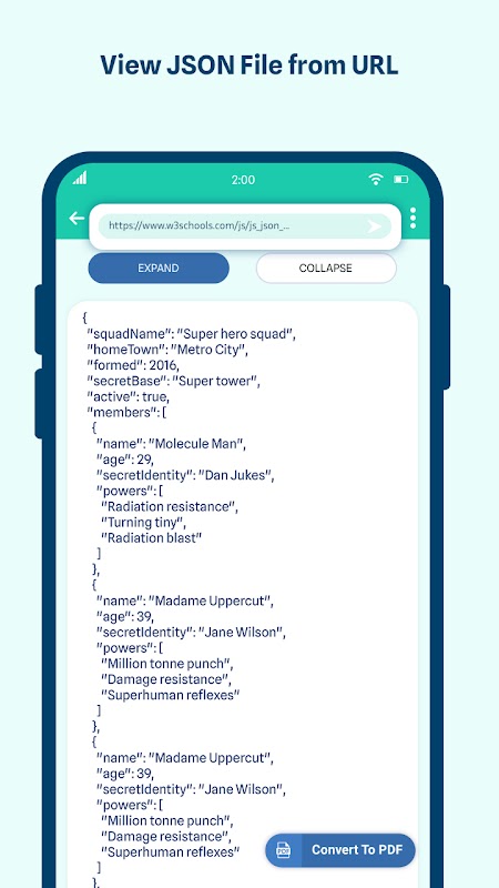 Aplikasi dapat memuat konten JSON dari File JSON di URL Web ke JSON Viewer. Kemudian, Anda dapat mengonversi ke PDF dan menyimpan file ke penyimpanan Anda.