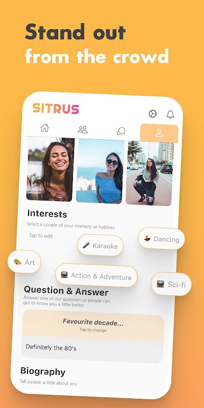‣ buat profil sosial dengan foto profil, bio, minat, pertanyaan, dan jawaban