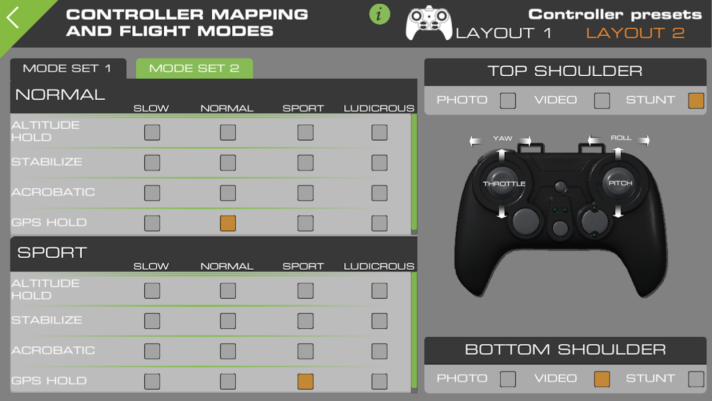 Configure your drone's flight profiles with a selection of flight modes and speeds.