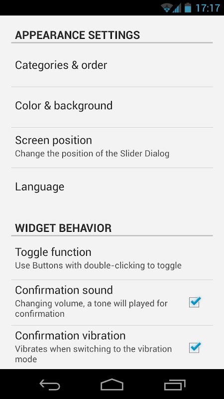 A small Widget that gives control of the screen brightness and the sound volume directly from your home screen. You can easily manage those with the widget's slider or your hardware buttons. With a double click, you can also use the buttons to toggle. Slider Widget shows 6 Categories (e.g brightness or ring volume), which you can choose from 7 categories (more below). You can also change the order of the categories displayed in Slider Widget.