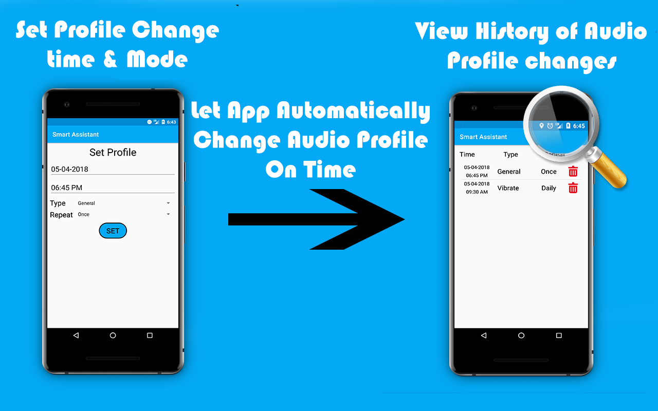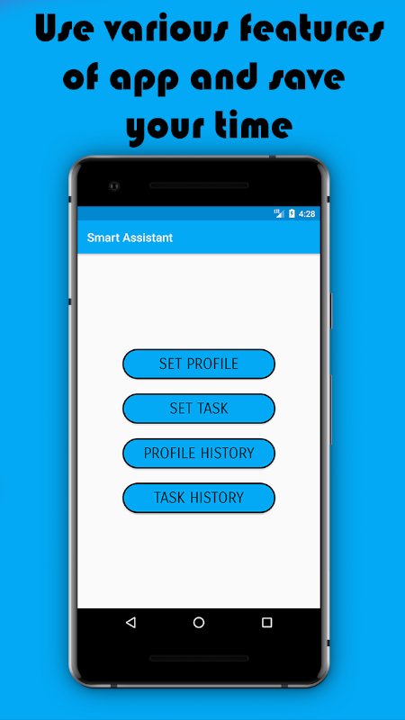 Now a days, mostly everybody having a smart phone,students having a smart phone sometimes forgot to keep their phone's audio profile to silent mode before entering to the lecture hall.If you are student then surely you have being experience this situation.Now this had been a long term problem so our app will keep their phone to silent mode automatically once its scheduled! Yeah you heard correct automatically, you just need to use this app and select your collage(any location) and select your desired profile mode, That's it.Now your so called assistant will take care of those places where you want your phone need to be silent.Also you can make your assistant(SmartAssistant) to keep your phone to any audio profile mode on the basis of specific date/time just by giving some instruction to it.
