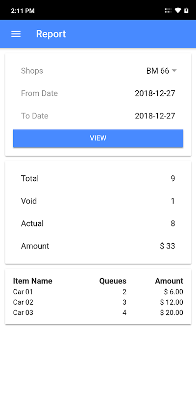 Aplikasi ini dapat digunakan untuk mencetak nomor antrian dengan harga barang (kebanyakan untuk layanan pembersihan mobil). Nomor antrian akan diatur ulang berdasarkan hari. Pada akhir hari pengguna akan dapat melihat laporan ringkasan.