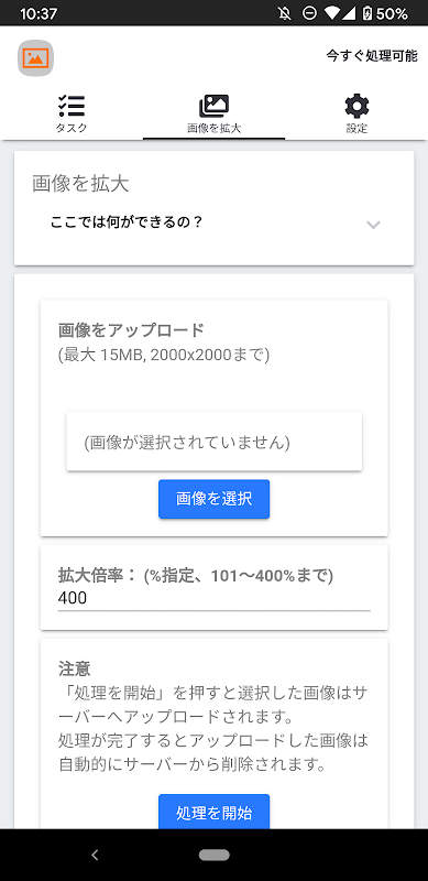 ・画像をAIを使って綺麗に拡大できるアプリです。通常画像は拡大すると粗くなってしまいますが、このアプリでは綺麗に元画像の最大4倍まで拡大することが出来ます。(元画像の最大解像度: 2000x2000)