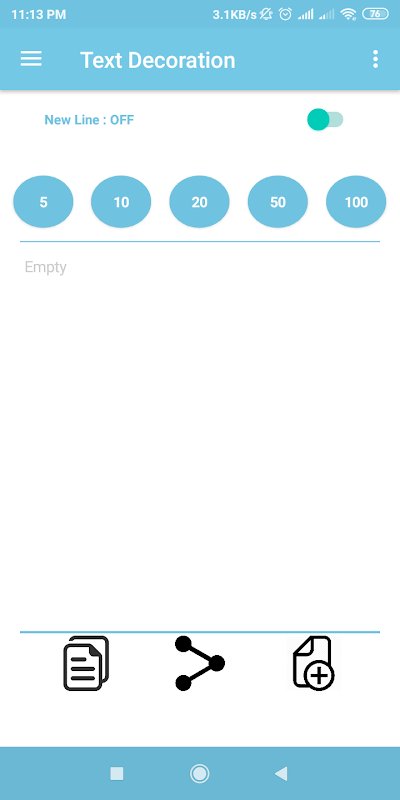 By using this application you can send the same message at multiple times. This app is combo pack for the all repetition app with a low size of the APK It is one kind of message repeater to send message repeatedly, and also you can set your repetition limit with new line text repetition. Using this app you can also make repeated letters using alphabet and emoji characters. Also, provide random emoji characters. Very easy to use and required few click for your message repetitions. Repetition process works asynchronously for longer repetition limits.