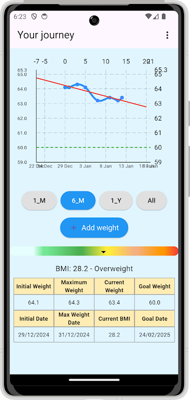Smart Weight Tracker adalah aplikasi sempurna bagi siapa saja yang ingin melacak berat badan dan BMI (Indeks Massa Tubuh) sambil mengawasi kemajuannya. Baik Anda mencoba menurunkan berat badan, menambah berat badan, atau sekadar menjaga keseimbangan, aplikasi ini adalah teman ideal Anda.