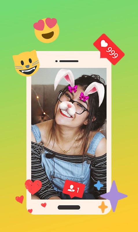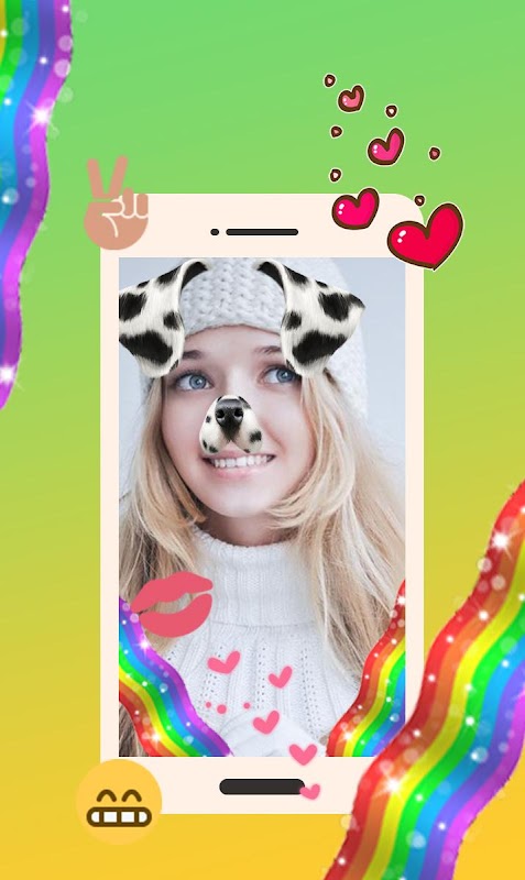 Add funny Filters, effects, puppy doggy face, rainbow effect, cute rabbit, lenses tears, tag text, stickers and emojis, 3D masks, flowers crown and more... to your selfie in just a few seconds!