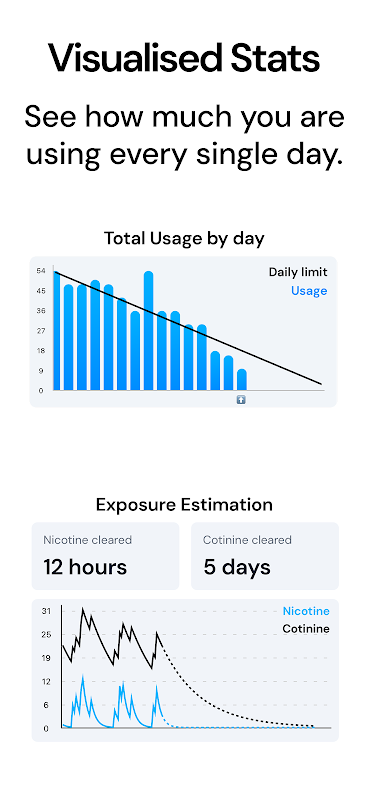 Visualisasikan penggunaan Anda: Lihat penggunaan Anda sebagai hutan hijau yang berubah menjadi kuning jika Anda melampaui batas yang Anda tetapkan. Atau masuk ke Mode Geek dan dapatkan grafik detail penggunaan Anda dan bagaimana tubuh Anda terpapar nikotin.