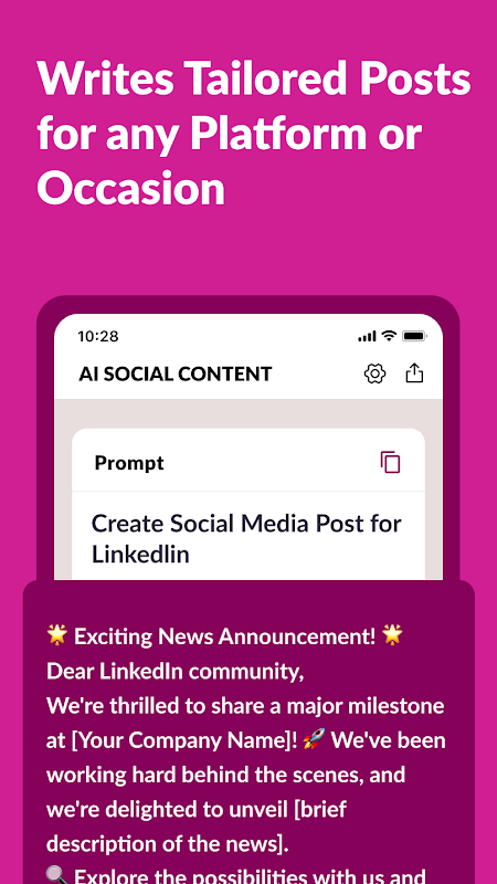 Tingkatkan kehadiran media sosial Anda dengan mudah dengan AI Social Media Content Generator! Baik Anda perlu membuat postingan menarik untuk LinkedIn, Instagram, Facebook, Quora, TikTok, Twitter, Reddit, Tumblr, atau Pinterest, aplikasi canggih ini siap membantu Anda.