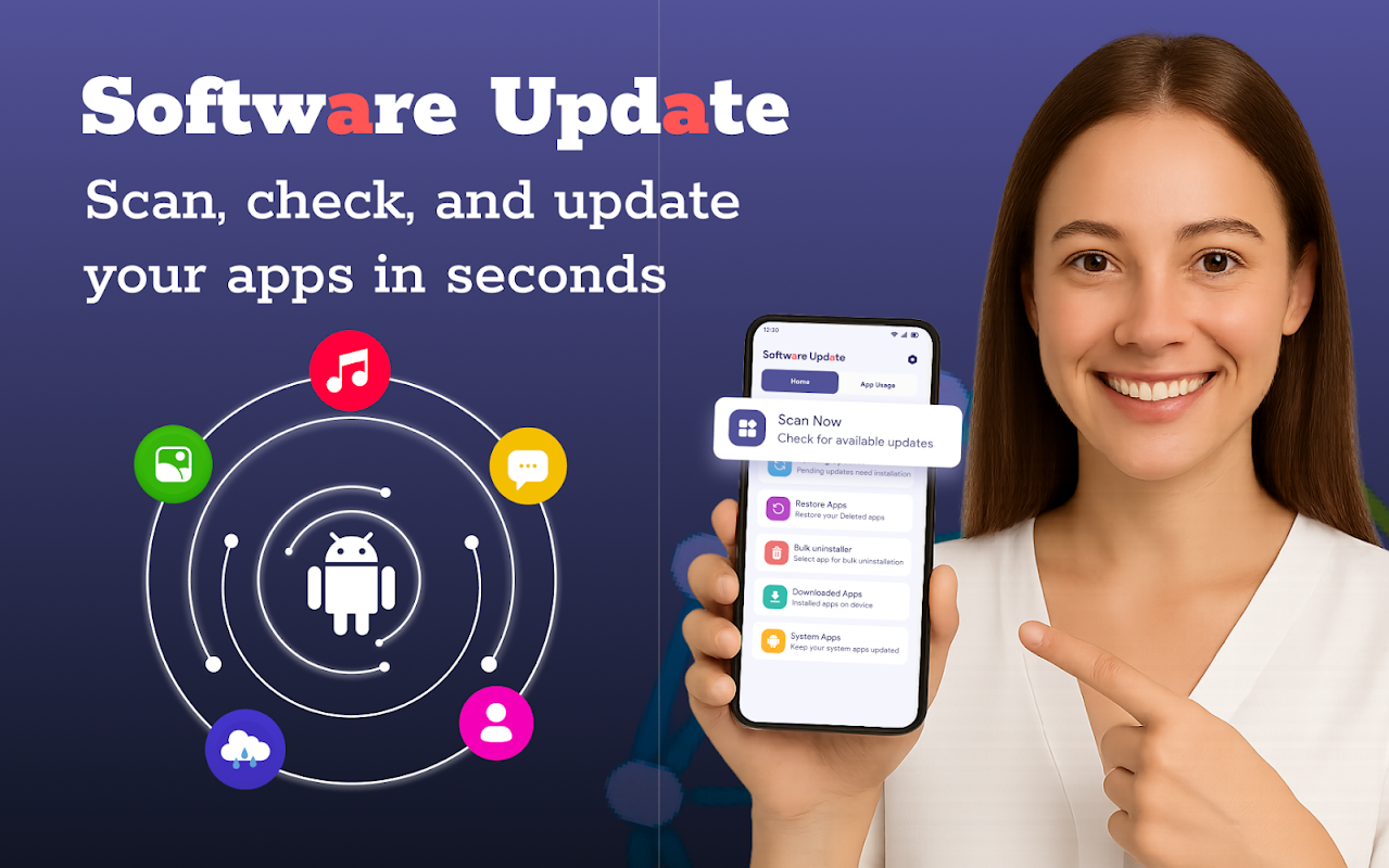 Aplikasi Pembaruan Perangkat Lunak menjaga perangkat Anda tetap terbarui sekaligus melacak penggunaan aplikasi. Fitur pemantauan cerdasnya mencatat seberapa sering atau berapa lama setiap aplikasi digunakan. Dengan perangkat lunak Pembaruan Aplikasi Ponsel, Anda dapat memastikan semua aplikasi dan game selalu berjalan pada versi terbarunya. Alat Pembaruan Perangkat Lunak memindai aplikasi terinstal dan sistem, dan dengan cepat menginstal pembaruan terbaru untuk kinerja optimal.