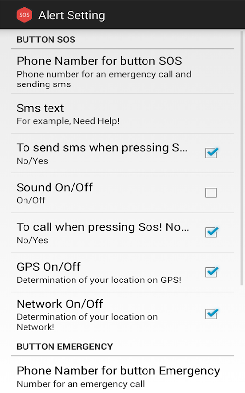 PS. before using the program, go to settings, add phone numbers for SOS buttons Home and 911. To enable the functions you need and add your text for Sms!