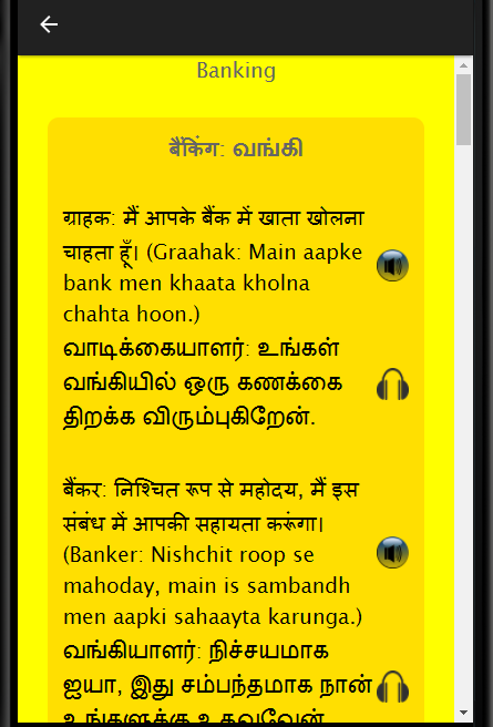 This language learning application can also be used by those Tamil speaking participants who are preparing for BPO, Call Center, Hindi Discussions and Debates as well as Hindi job interview. If you want to learn Hindi grammar, it is advised that you initially go through this application get yourself ready for your next assignment. If I want to learn Hindi, I should be approaching this application for the same and go through all the chapters. This app can help you learn Hindi fast using audio. It is easier to learn the language using Hindi conversation rather than through an Hindi Dictionary. Learning Spoken Hindi had never been easier. Exercises, vocabulary and business Hindi make this application a very special one.
