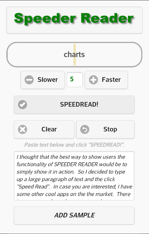 Simple app to let you Speed Read one word at a time to avoid the lag of moving eyes and changing lines. Just paste in the article you want to SpeedRead, choose your read speed, and go!
