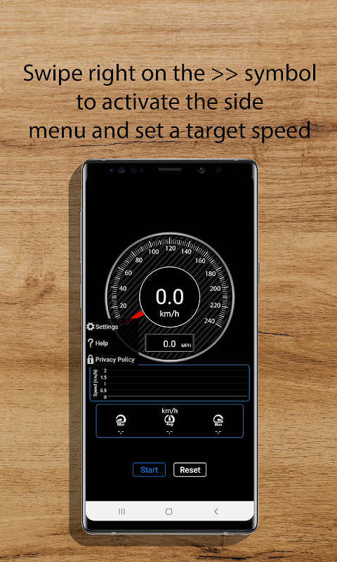 Pengukur kecepatan mengukur perpindahan kecepatan pengguna menggunakan GPS smartphone. Speedometer GPS memerlukan ruang kosong untuk berkomunikasi secara memadai dengan satelit yang menyediakan GPS. Data ditampilkan di layar perangkat dalam bentuk analog dan digital. Aplikasi ini menunjukkan kecepatan maksimum, rata-rata, dan minimum dalam km/jam. Selain itu, grafik kecepatan pengguna ditampilkan. GPS Speedometer dapat dikonfigurasi untuk membunyikan alarm saat melebihi kecepatan yang ditetapkan oleh pengguna. Unit kecepatan ditampilkan dalam km/jam dan MPH.