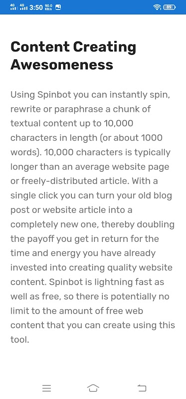 Dengan menggunakan Spinbot, Anda dapat langsung memutar, menulis ulang, atau memparafrasakan sebagian konten tekstual dengan panjang hingga 10.000 karakter (atau sekitar 1000 kata). 10.000 karakter biasanya lebih panjang dari rata-rata halaman situs web atau artikel yang didistribusikan secara bebas. Dengan satu klik Anda dapat mengubah postingan blog atau artikel situs web lama Anda menjadi artikel yang benar-benar baru, sehingga menggandakan hasil yang Anda dapatkan sebagai imbalan atas waktu dan energi yang telah Anda investasikan untuk membuat konten situs web berkualitas. Spinbot cepat kilat dan juga gratis, jadi kemungkinan tidak ada batasan jumlah konten web gratis yang dapat Anda buat menggunakan alat ini.