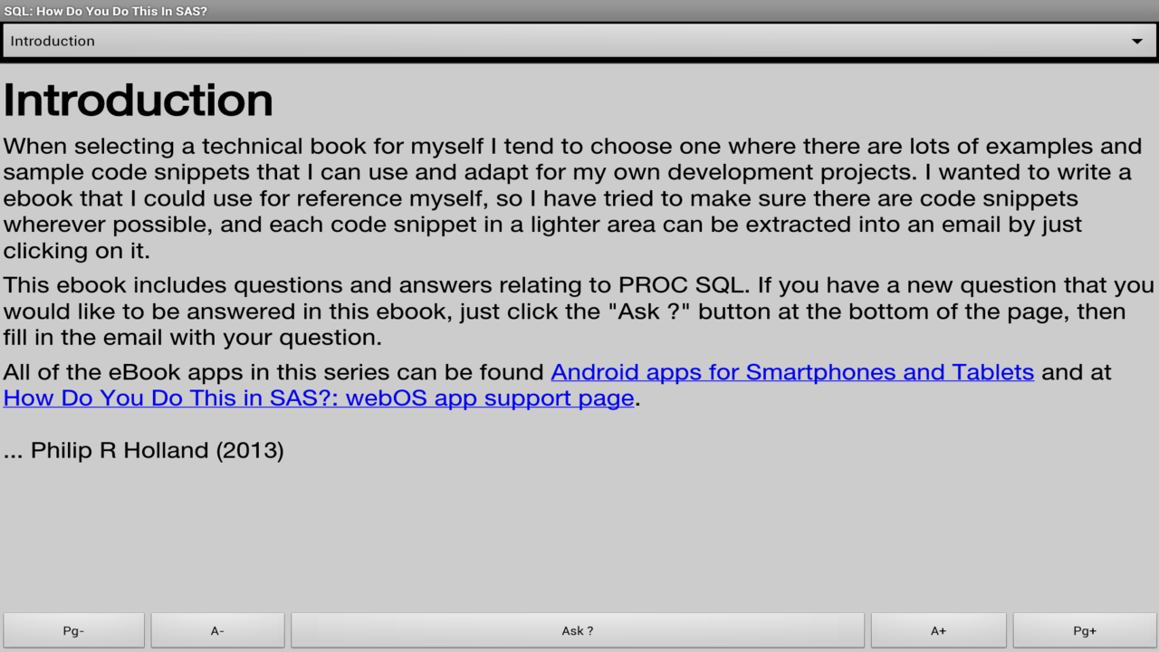 This app, "SQL: How Do You Do This In SAS?", is one of a series of eBooks about SAS software programming focusing on frequently asked questions and answers about SQL, illustrated by code samples which can be sent by email directly from the app. It is designed to encourage users to contribute questions some of which will be included in future versions of the app. There are controls to select specific questions, move to the previous or next question, decrease or increase the font to suit the user's preference, and send emails requesting answers to questions not yet included in that version of the eBook.