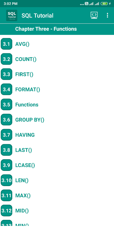 Aplikasi Tutorial SQL mencakup topik-topik berikut -