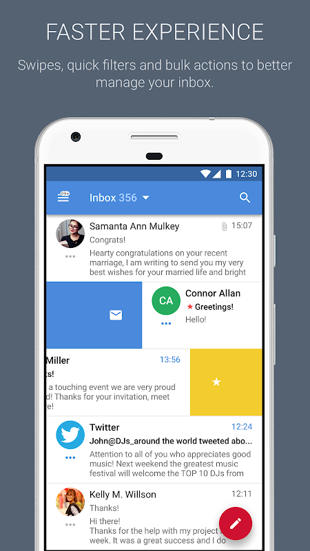 Gerakan Gesek - Bagian dari desain responsif, opsi gesek cepat yang dapat disesuaikan membuatnya mudah untuk mengelola Kotak Masuk Anda dengan cepat.