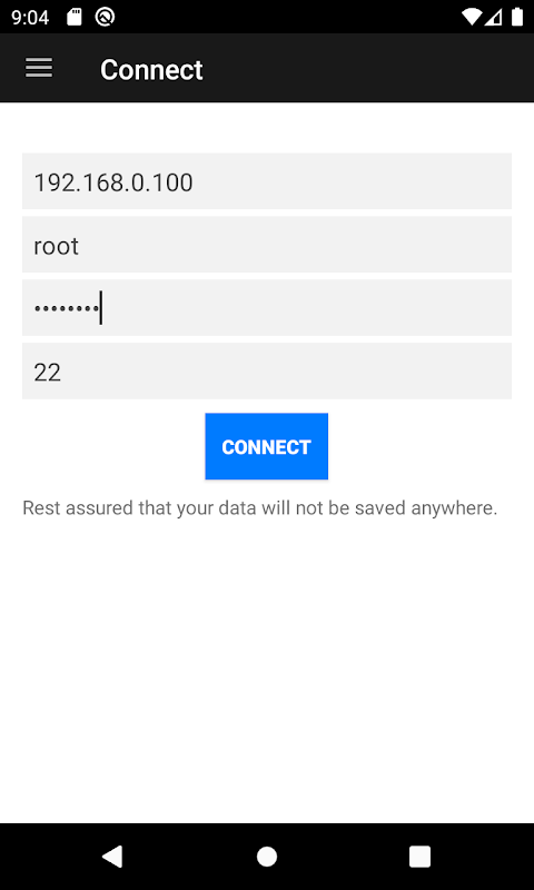 Tanpa Penyimpanan Data: Kami menghargai privasi dan keamanan Anda. SSH Connect tidak menyimpan atau menyimpan informasi login Anda, memastikan kredensial Anda tetap rahasia.