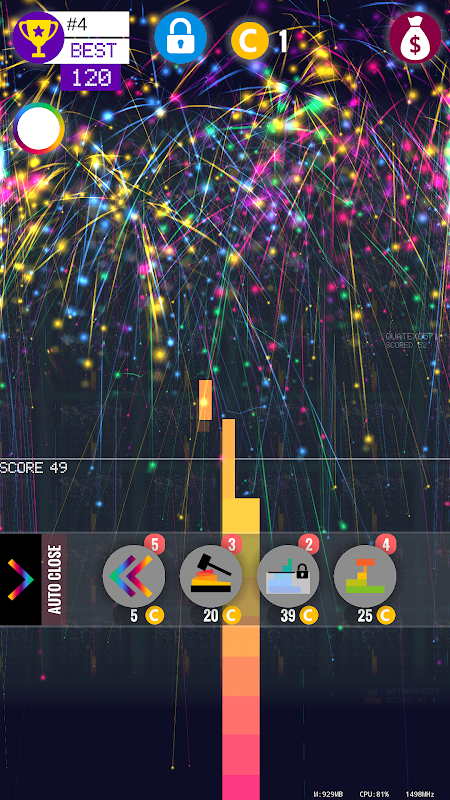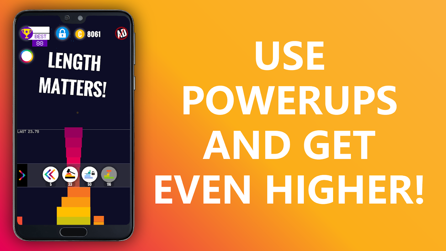 Stack batu bata berwarna-warni, mengumpulkan koin, penggunaan powerups dan bahkan lebih tinggi!