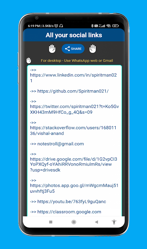 Now you can store your all social media links in one place. so that you can share all your important links at right time, like your Linkedin profile URL, Github project URL, your Instagram account URL, Email IDs, etc.