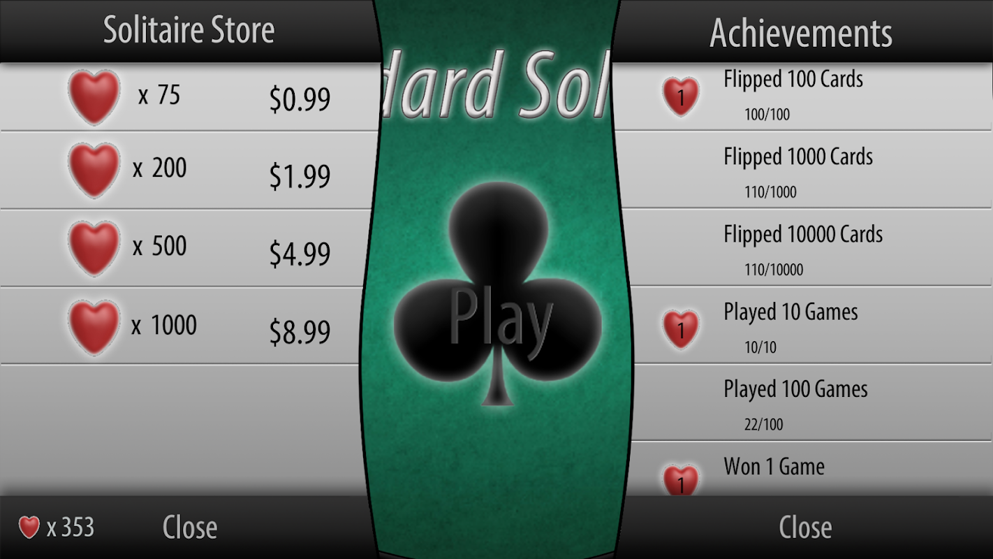 If you love to play card games, Standard Solitaire is the right choice for you! With new card and board designs regularly added to our game you will never get bored of playing. Our FREE solitaire app gives you many achievements to unlock while hitting those high scores. Standard Solitaire can keep your brain challenged and entertained at once. A great way to kill time and relax your mind!