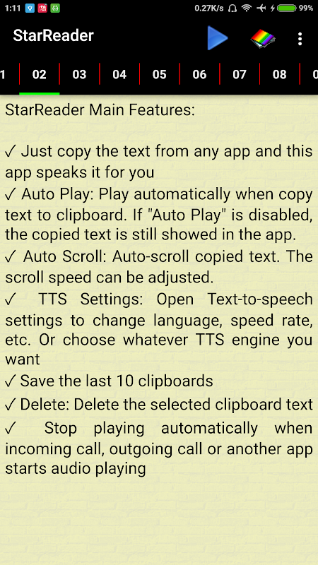✓ Auto Play: Play automatically when copy text to clipboard. If "Auto Play" is disabled, the copied text is still showed in the app.