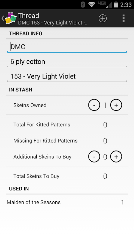 Tentu saja, Anda juga dapat melacak ketika Anda memulai sebuah proyek dan apa kain yang finish tertentu pada, serta pergantian pemain yang Anda buat. Dan data Anda selalu milikmu! Mudah mengekspornya sebagai file teks terbaca-manusia untuk back-up atau berbagi. Ekspor hanya informasi untuk satu pola untuk berbagi dengan sesama stitchers. Sebuah dibangun dalam kain kalkulator memberitahu Anda apa kain ukuran yang Anda butuhkan untuk pola, berdasarkan default Anda masukkan. Bagian yang terbaik? Ini semua gratis untuk Anda!