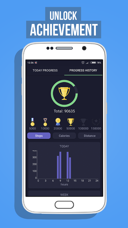 Dengan bantuan grafik Anda bisa mengikuti statistik langkah Anda. Lihat grafik selama 24 jam terakhir, satu minggu atau satu bulan.