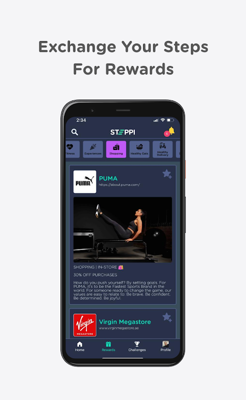 Steppi memotivasi Anda untuk lebih aktif dan mendapatkan hadiah dengan berbagai tantangan bawaan, klik untuk ikut serta dalam tantangan langkah sederhana dan saksikan dompet Steppi Anda tumbuh! Apakah Anda siap untuk kompetisi persahabatan? Apa pun tingkat kebugaran, usia, atau gaya hidup Anda, Steppi mendorong Anda untuk bersenang-senang dan aktif.