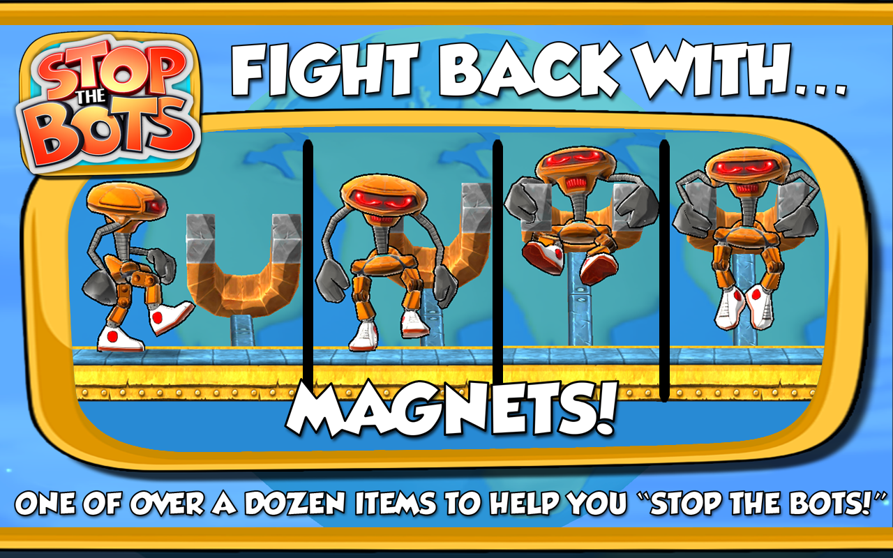 Only you can stop the robot filled alien ship from attacking Earth by sneaking on board and disabling it from the inside! "Stop The Bots" perfectly blends arcade action and logic puzzles over 90 brain bending levels!